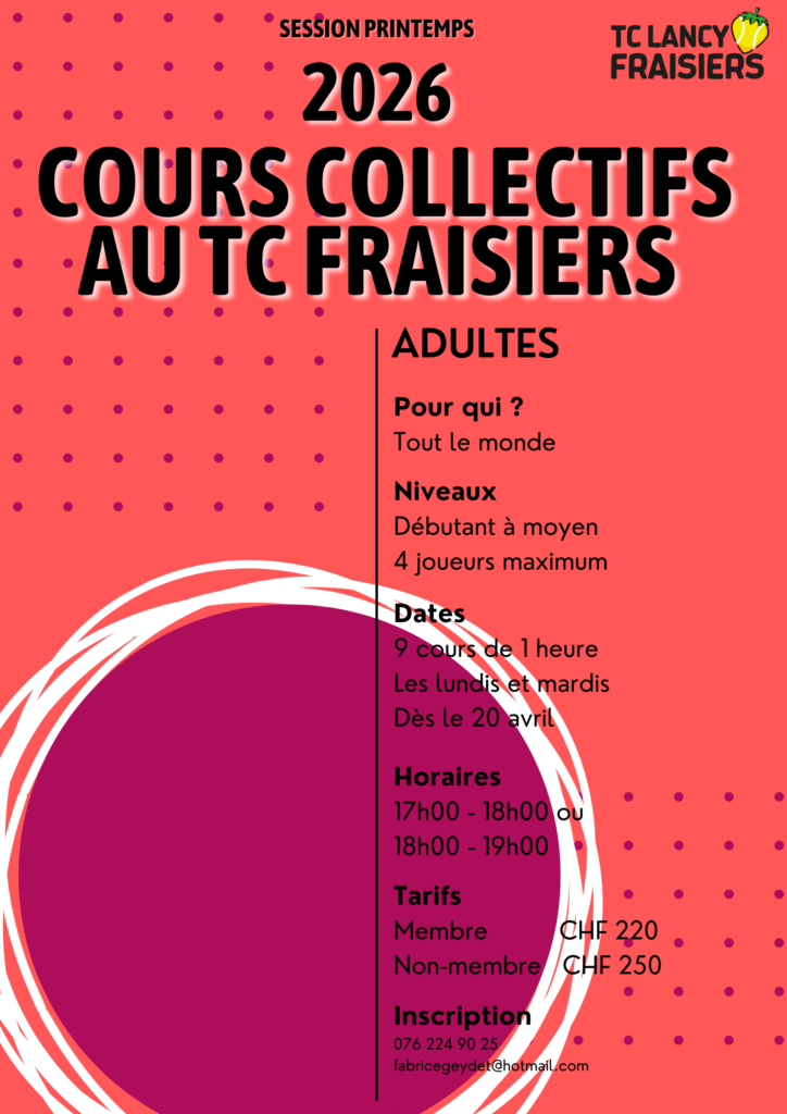 Les cours se déroulent sur toute l’année scolaire, soit du mois de septembre au mois de juin. La session comporte 35 leçons de 60 minutes et coûte CHF 600.- L’inscription a lieu chaque année le premier mercredi de la rentrée au club-house. Pour d’autres informations vous pouvez nous écrire à : ecole@tcfraisiers.ch