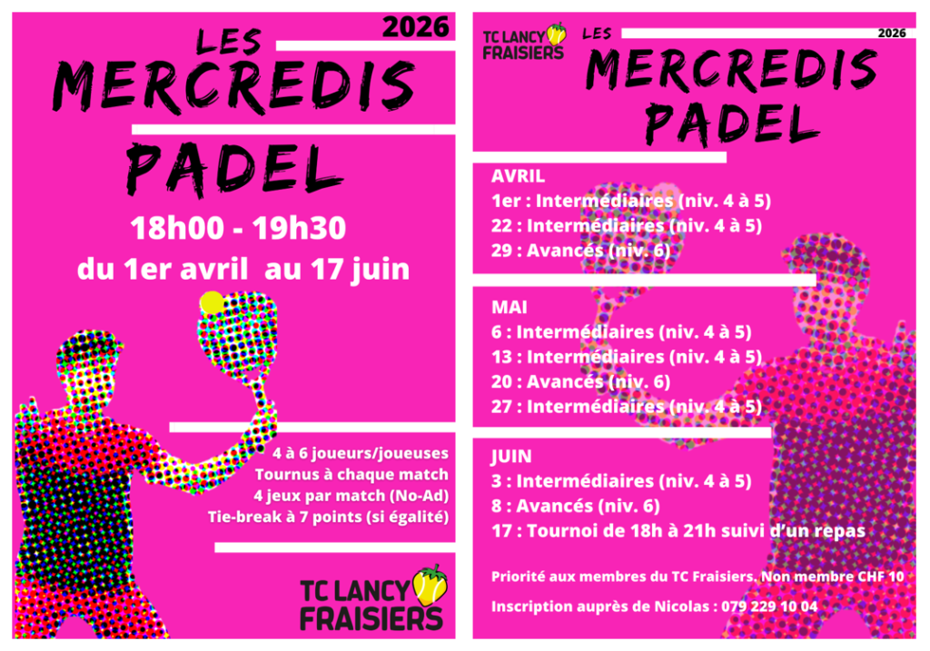 Ce début de saison marquera aussi le retour des mercredis padel, dès le 1er avril, en donnant cette année la priorité aux membres. Les cours collectifs adultes débuteront le 20 avril. Toutes les informations sont disponibles sur notre site web www.tcfraisiers.ch.
